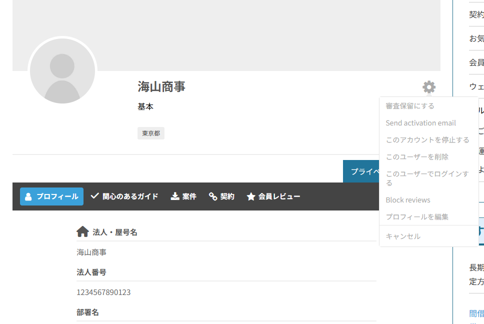 会員詳細ページでギアアイコンをクリックすると、そのユーザーに対するアカウント操作のメニューが開きます。