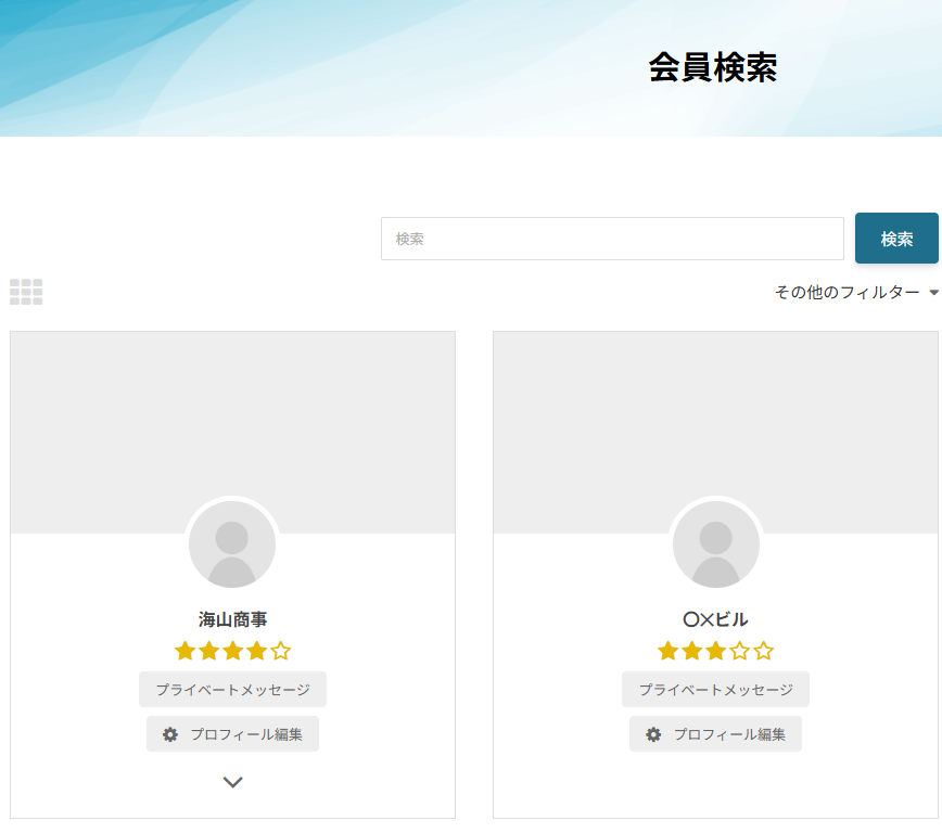 このページで、キーワードによる会員検索がができ、一覧表示はグリッド表示とリスト表示を切り替えることができます。